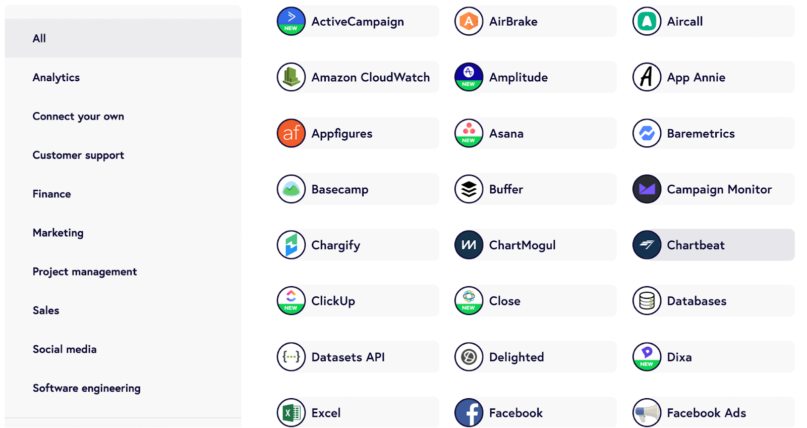 With Geckoboard, you can import data from over 80+ data sources. Some of its popular integrations include: