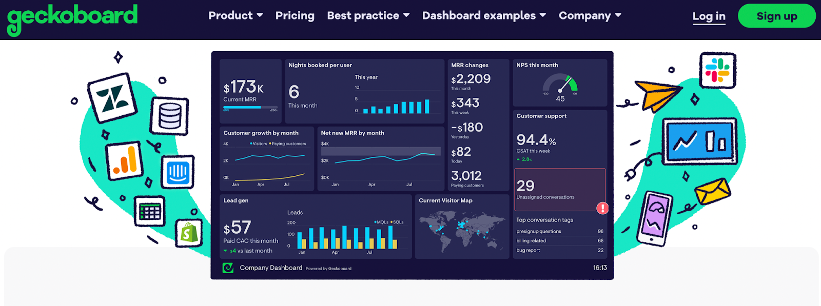 Like Databox, Geckoboard is a dashboard software that lets you track KPIs hassle-free. The platform offers 80+ data sources that you can integrate your account to without coding.